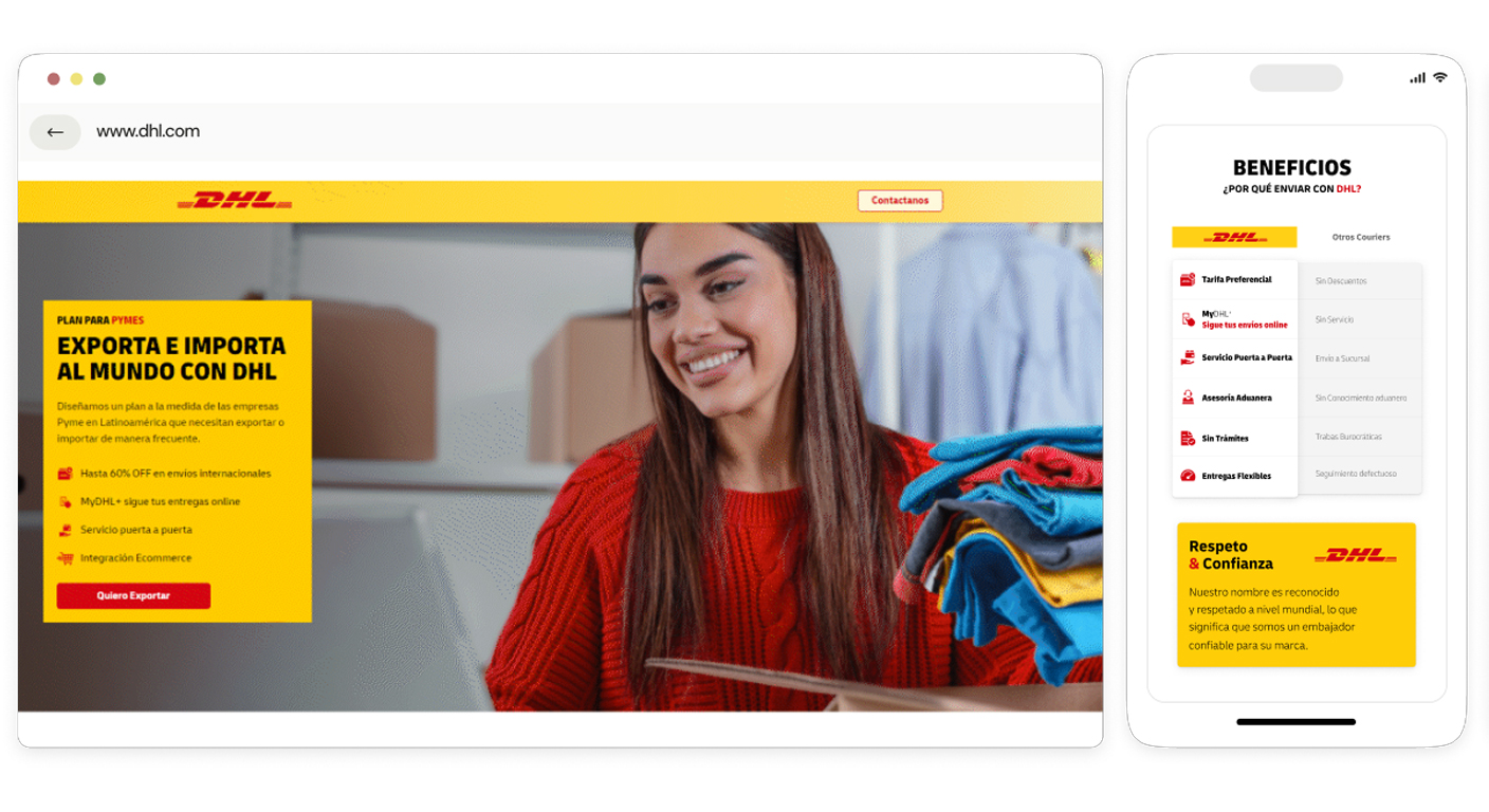 Nuestro trabajo con DHL Nuestra agencia de marketing se asoció con DHL para crear campañas dirigidas a emprendedores latinoamericanos que buscan exportar sus productos de